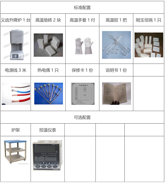 主機1臺,坩堝鉗1把,高純氧化鋁坩堝2個,說明書、合格證、保修卡各1份 |