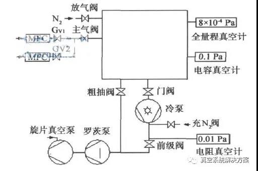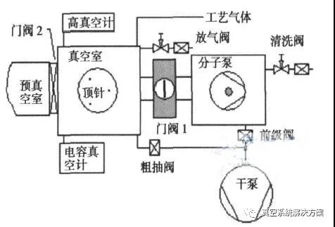 這類設備有PECVD, RIE, ICP 等。常涉及到特殊氣體和特殊反應物, 其真空室比較小, 常使用分子泵抽高真空。現以某ICP 為例進行說明, 真空結構如圖2, 圖2 真空室約30 L。出現故障后, 做3 min靜壓檢漏, 真空室壓強上升率超過允許值1.3 × 10- 1 Pa/ min, 達到10 Pa/min。用He 檢漏儀進行檢漏, 發現真空室頂針下方的疊片可伸縮波紋管漏, 拆下該波紋管, 維修后裝回, 檢漏發現該處已恢復正常。但是啟動設備進行靜壓檢漏時發現真空室壓強上升率為1 Pa/ min, 仍然大于允許值。繼續檢漏, 停了分子泵, 沒有停干泵, 發現門封漏率達1.4 × 10- 8 Pa.m3/ s。停了干泵, 真空室壓強由6.5 Pa很快上升到30 Pa, 顯然有氣體通過真空管道漏到真空室。打開粗抽閥與干泵相連的端口進行檢漏, 漏率為2 × 10- 8 Pa.m3/ s, 因此維修了該閥, 但是再檢漏沒有通過, 只能更換該閥門。將與分子泵相連的清洗閥拆下, 噴He 檢門閥1, 發現門閥1 漏率為5 × 10- 8 Pa.m3/ s。將清洗閥裝回, 拆下門閥修理后裝回, 門閥恢復正常。然后, 在維修模式下用干泵抽真空室和分子泵腔室, 在保證門閥兩側壓差<1 × 103 Pa的情況下打開門閥1, 使真空室和分子泵腔室連通, 檢測分子泵上的管道和閥門, 沒有發現新的問題。
