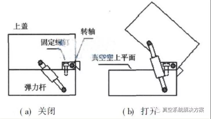 最后維修門封處的漏點。換門封密封圈, 漏率未見好轉。仔細檢查門封處的結構, 發現上蓋有一個螺釘向下突出, 導致門封密封不好。但是將螺釘拆下比較困難, 因為這需松開上蓋。上蓋連有水冷管道, 限制了上蓋移動范圍; 上蓋右側通過轉軸與真空室上平面相連, 同時上蓋與真空室下方用彈力大的彈力桿頂著, 導致拆卸安裝困難, 詳情見圖3。后來發現打開上蓋, 彈力桿的彈力變得很小,這時方便拆裝彈力桿; 松開兩塊檔板后露出兩個螺釘, 松開它們就可以松開轉軸。就這樣松開了上蓋, 將下墜的螺釘向上擰緊, 再將上蓋裝好, 門封恢復正常。啟動設備確認故障已修好。